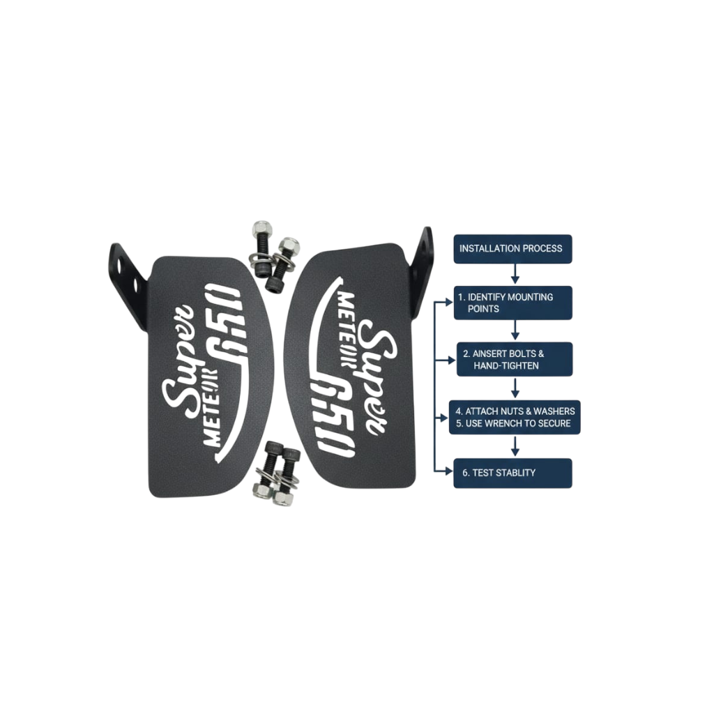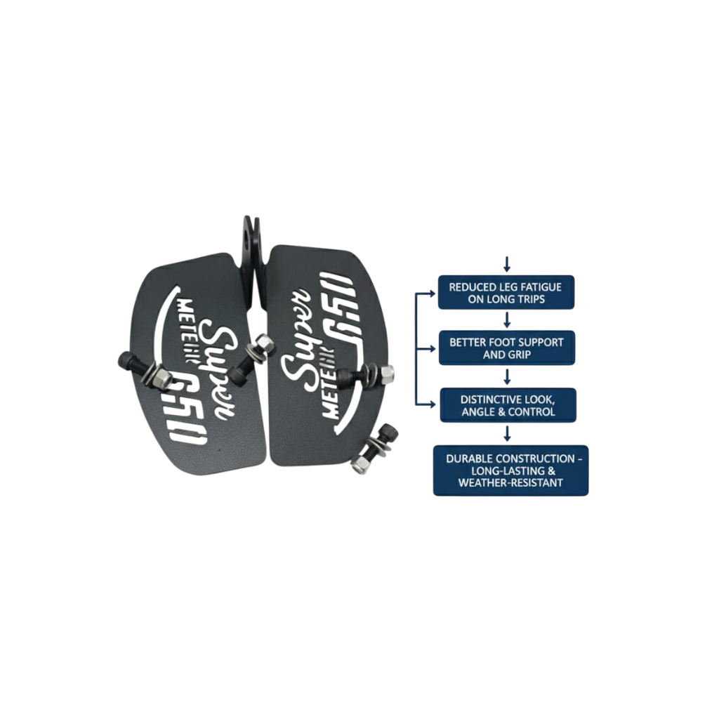 Enhance riding comfort with these Royal Enfield Meteor 350 footrest extension plates, specially designed to provide better foot positioning and reduced fatigue during long rides. Manufactured using high-quality metal with laser-cut precision, these motorcycle foot peg extenders ensure strength, durability, and a perfect fit. The matte black powder-coated finish adds a premium look while protecting against rust and wear. These bolt-on footrest extension plates improve rider ergonomics without modifying the stock setup. Ideal for touring and daily riding, this aftermarket footrest extender pair is easy to install and designed exclusively for the Royal Enfield Meteor 350.